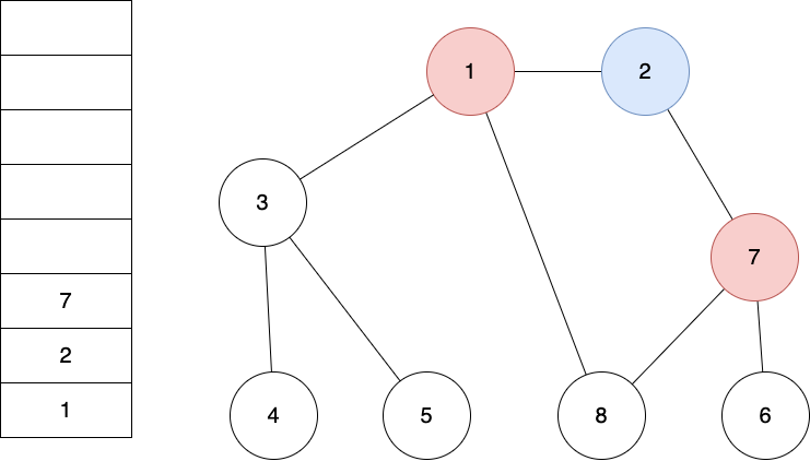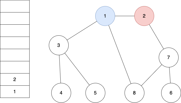 - 탐색 순서는 1 → 2 → 7 → 6 → 8 → 3 → 4 → 5 순서로 방문하게 됩니다.