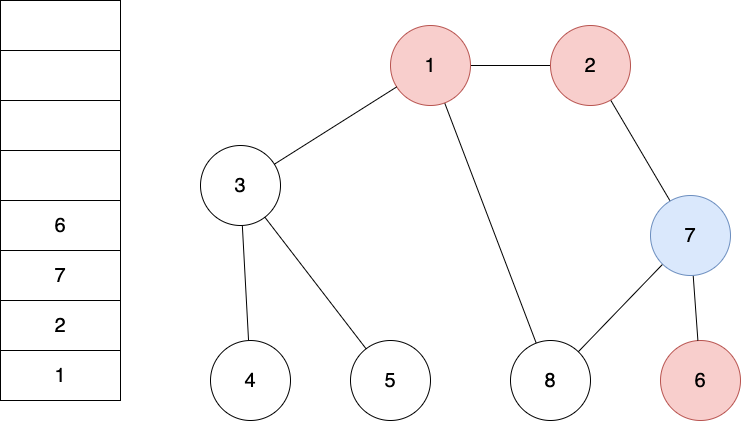 - 스택의 최상단 노드인 ‘7’에 방문하지 않은 인접 노드 ‘6’, ‘8’이 있습니다.