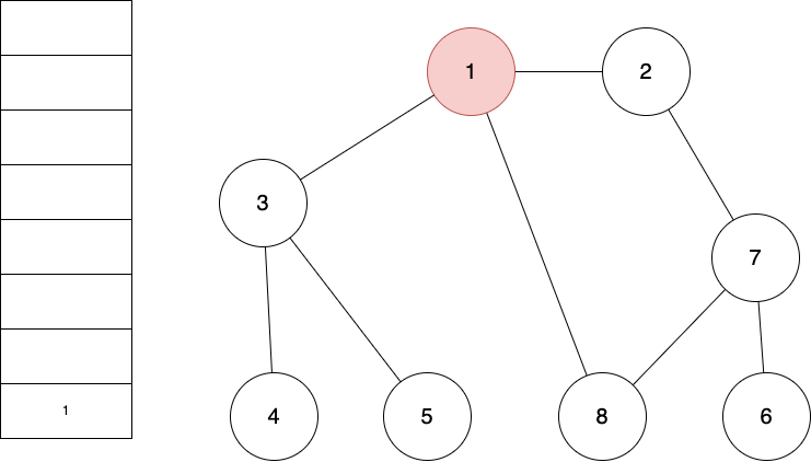 - 스택의 최상단 노드인 ‘1’에 방문하지 않은 인접 노드 ‘2’, ‘3’, ‘8’이 있습니다.