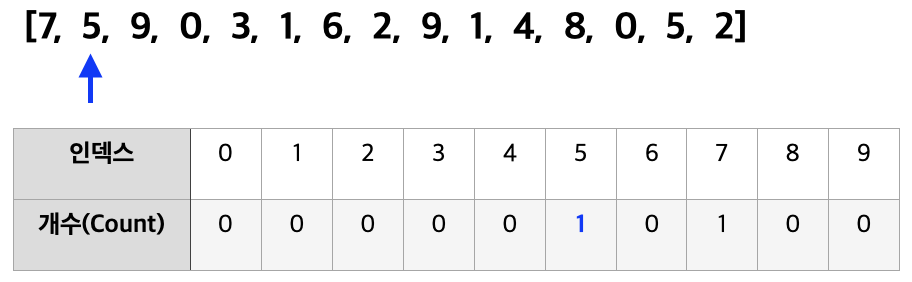 2. 데이터를 하나씩 확인하며 데이터의 값과 동일한 인덱스의 데이터를 1씩 증가 시킨다.