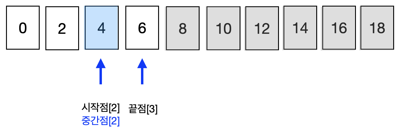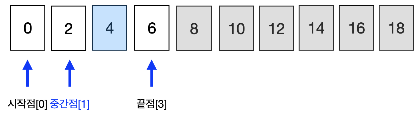 3. 중간점[1]의 데이터보다 찾고자하는 데이터가 크기 때문에 시작점[0]의 위치를 중간점 오른쪽으로 옴겨준다.